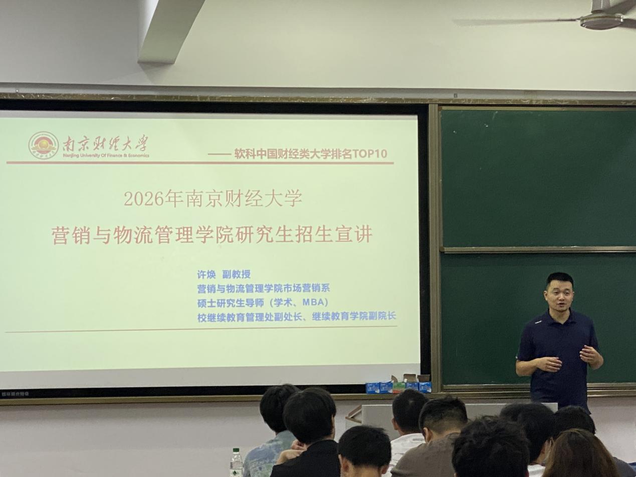 宣讲会上,许焕副教授首先介绍了南京财经大学的办学实力,强调学校位列软科中国财经类大学排名TOP10,在财经领域具备深厚的学术积淀与行业认可度。随后,他聚焦营销与物流管理学院的研究生培养体系,从学术硕士与MBA项目的培养目标、课程设置、师资力量等方面展开详细阐述。