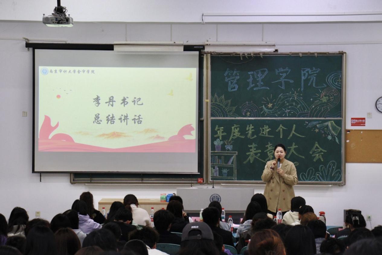 发言环节结束后,管理学院李丹书记作总结讲话。她首先向所有获奖同学表示热烈祝贺,肯定了同学们在过去一年里在学业、学生工作、志愿服务等各方面取得的优异成绩;同时对全院同学提出殷切期望,希望大家以先进为榜样,见贤思齐、奋勇争先,在未来的学习生活中持续精进,不负韶华、不负时代,以更饱满的热情、更昂扬的姿态奔赴成长之路,为学院发展贡献青春力量。