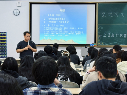 为贯彻落实《南京审计大学金审学院卓越人才培养行动方案》,扎实推进研究型卓越人才培养工作。2026年4月20日晚,2023级考研动员会在C南503教室顺利召开。本次动员会由行政管理系时静主持,管理学院院长季媛媛、艺术设计学院书记庄怀军、辅导员于淼出席活动,2023级行政管理专业所有学生参加会议。